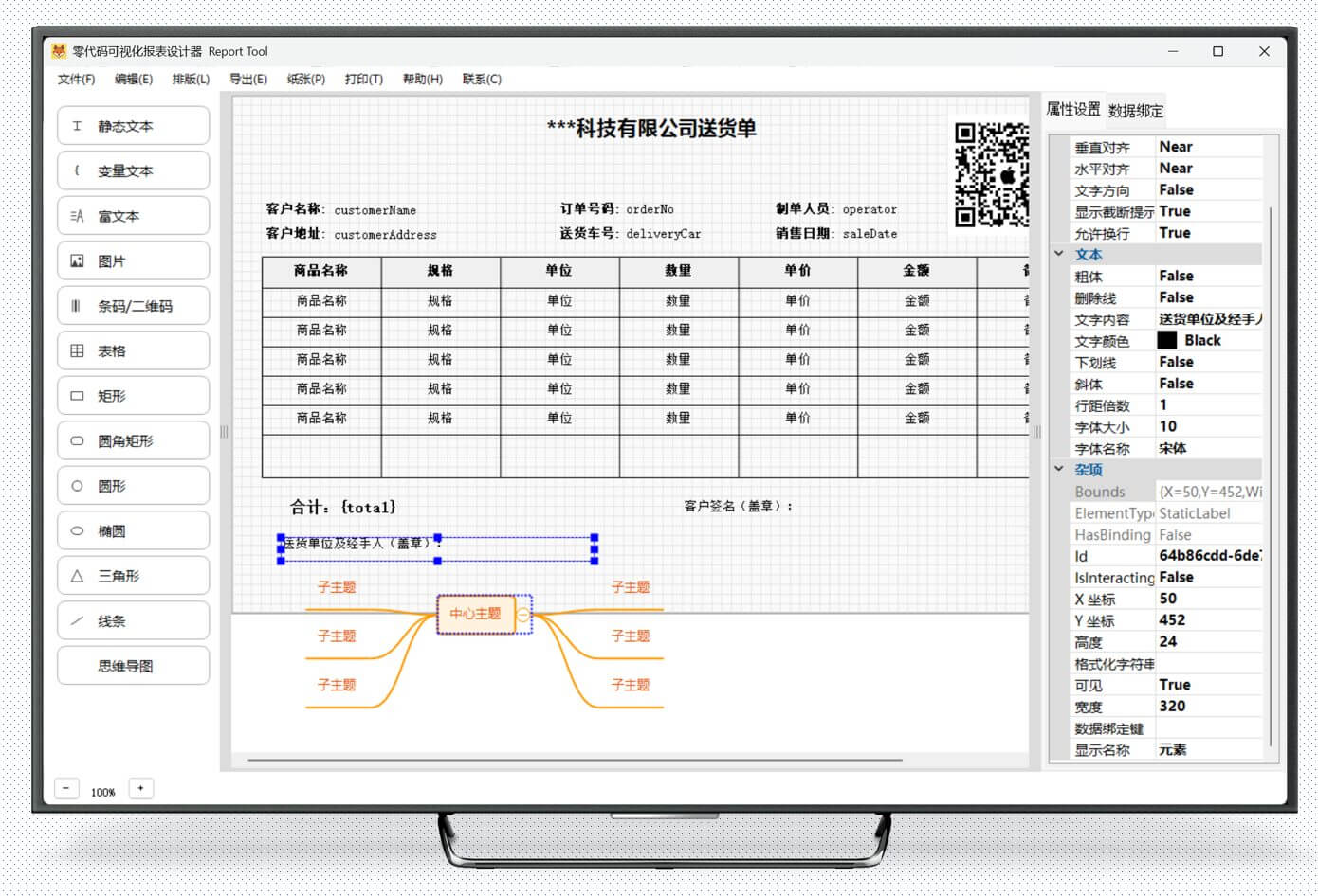 - 所见即所得设计器,拖拽即用、零代码、高度灵活(任意表格样式),支持思维导图、文本、富文本、图片、表格、条码、二维码、基础形状等丰富元素