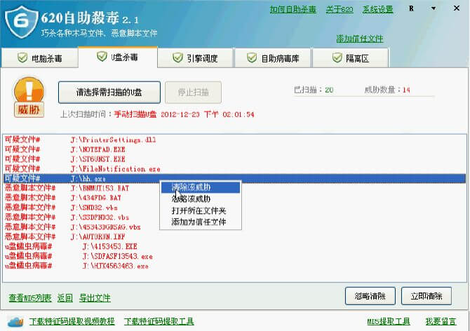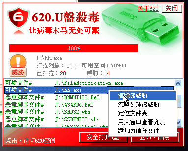 支持自主查毒、杀毒,无需掌握高深的专业知识,计算机安全不能完全依赖主流杀毒软件!最安全的方式,还是用户自己具备一定的查毒知识和实战经验。而620自助杀毒正是为此目的而设计,辅助您自己动手保障系统安全!