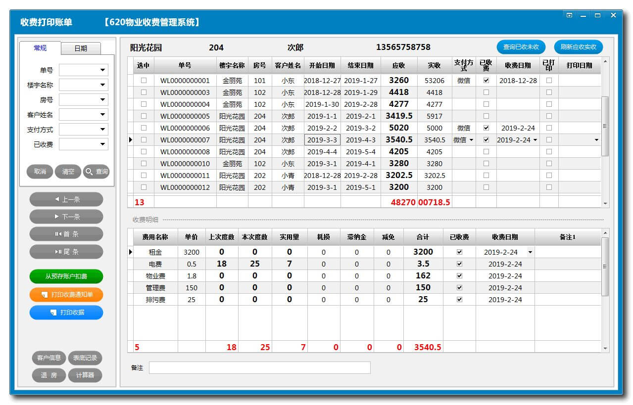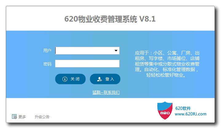 620物业收费管理系统V8.1,适用于小区物业、公寓、出租房、写字楼、工厂、店铺、市场铺位等各种物业租赁、收费管理,可同时多人联网使用管理多单元、多栋、多处物业;软件操作简单,从水电表录入、费用收据生成、到一键批量出收据、群发短信催收流程可在3分钟内完成,比传统管理至少提高5倍效率。功能模块包括:房源管理、收费管理、到期提醒、短信群发、预存资金管理、收支管理、员工与薪资管理、数据统计、报表收据格式自定义、批量打印、资产管理、数据导入导出、收费项与收费规则自定义、用户权限分配管理、数据备份与恢复等。