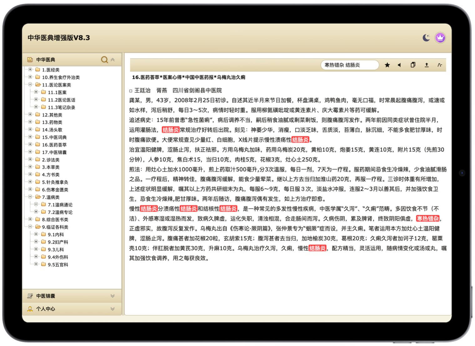 - 海量权威资源:收录4000+中医经典书籍、方剂、草药及医案,覆盖核心权威典籍